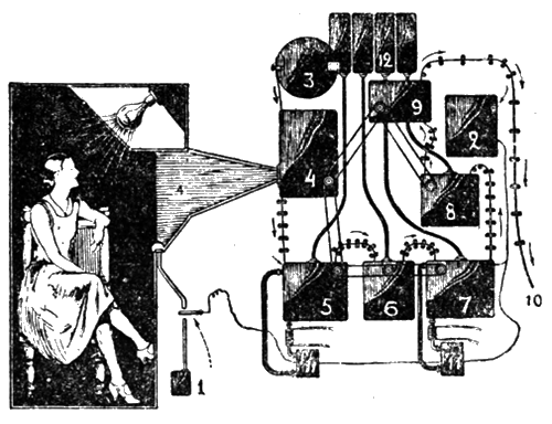 Дело в том, что всякая ложь или вообще заведомая неправда требует от нас некоторого психического усилия. Когда мы рассказываем о действительных, хорошо нам памятных фактах, наша речь льется плавно, не требуя особых мозговых усилий, но если мы хотим солгать, – мы должны что-то придумать, сделать какое-то – пусть быстрое и незначительное – но все-таки некоторое умственное усилие. У некоторых это усилие вызывает смущение, беганье глаз, дрожь в голосе, краску на лице – общеизвестные признаки, по которым любой судья или следователь, обладающий мало-мальским психологическим опытом, сумеет уличить свидетеля. Но есть люди, умеющие в высокой степени владеть самим собою – уличить их во лжи чрезвычайно трудно. Тем не менее и для них насилие над самим собой, т. е. ложь, отражается в ничтожном изменении характера их пульса, что посредством чувствительного кардиографа (прибор для наблюдения над работой сердца), может быть отмечено на самопишущем приборе. На рис. 1 изображен общий вид такого прибора, построенного Г. Сэлисбери и оказавшего уже несколько ценных услуг при допросе преступников.