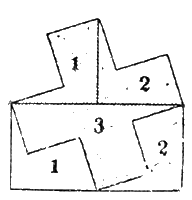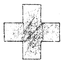 Вот общеизвестная фигура правильного, т. называемою греческого креста. Разрежьте его через середину на три части таким образом, чтобы, сложив их, вы получили бы прямоугольник, у которого одна сторона вдвое длиннее другой стороны. Если вы решите эту задачу в 10 минут, значит у вас хорошее уменье комбинировать формы.