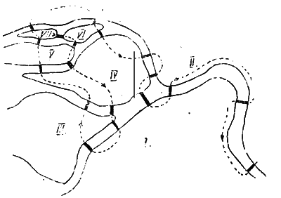 Составив таблицу (см. реш. 1-ой задачи), увидим, что сумма цифр третьего столбца равна 19, т. е. на единицу больше, чем число всех мостов. Значит – обход возможен. Один из таких возможных маршрутов показан на помещаемом рисунке. Ленинградские мосты позволяют еще более обобщить закон Эйлера. Не прибегая к составлению таблиц, можно заранее сказать, что задача разрешима: