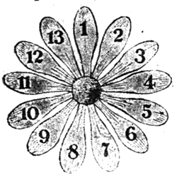 Обозначим лепестки номерами, как показано на рисунке. Предположим, что ваш противник отрывает № 1, вы отрываете № 7 и № 8, лежащие против № 1 и делящие цветок на две одинаковых части (между 1 и 7 – остается 5 лепестков, и столько же между 8 и 1). Если он отрывает № 1 и № 2, вы отрываете опять таки противоположный им № 8, и тем так же делите цветок на две одинаковых части. После этого вы повторяете «игру» противника, но в противоположной половине: если он, напр., срывает слева один лепесток, вы срываете один справа, если он срывает справа два лепестка, вы делаете то же в левой части. В результате – сорвать последний лепесток – выпадает на долю вашего противника.