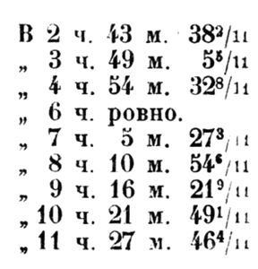 Итак, обе большие стрелки при заводе стояли вместе в 12 часов и секундная стрелка стояла на 60. Минутная стрелка двигается в 12 раз быстрее часовой, удаляясь от нее в каждую минуту времени на 11/12 минуты по циферблату. Стрелки совпадут через 60:11/12 минут или через 65 мин, 27 и 3/11 сек. За половину этого времени – в 12 часов 32 мин., 43 7/11 сек., стрелки будут стоять одна против другой по прямой линии. Такое противостояние будет регулярно повторяться через 1 час, 5 мин., 27 3/11 сек.—т. е.