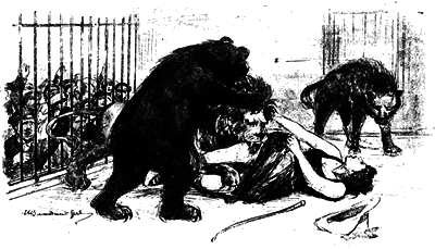 Не успела публика охнуть, как картина переменилась. В свою очередь с страшным ревом Робинзон навалился на льва и смял его своими могучими лапами.