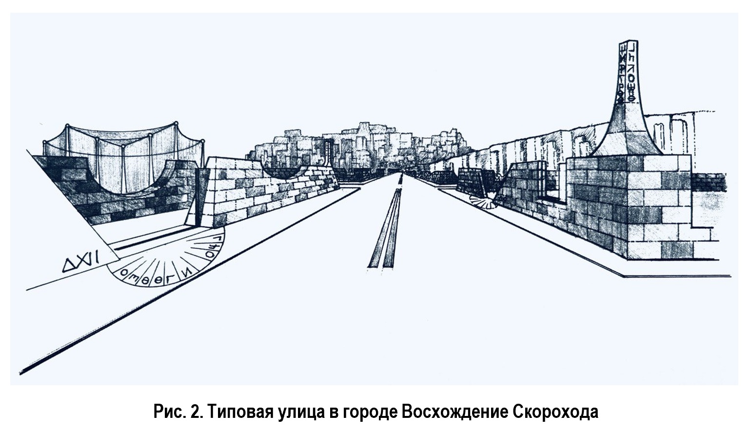 На рис. 2 показан вид типовой чильской улицы в Восхождении Скорохода, согласно представлениям архитектора. В отдалении видны Восточнополярные горы, справа – возвышается утесы Южной Оконечности, отмечающие местоположение одноименной линии разлома. Главная улица тянется с востока на запад, жилища по обеим ее сторонам вплотную примыкают к тротуарам. Вблизи восточного полюса линии магнитного поля выходят из земли и поднимаются вертикально вверх, поэтому любое направление является тяжелой осью, а поперечные улицы расположены под прямым углом друг к другу. В городах, удаленных от магнитных полюсов – например, в столице, которая носит имя Рая Светила – «поперечные» улицы образуют с восточно-западными, параллельными легкой оси, угол от тридцати до шестидесяти градусов. Перемещаясь по этим улицам, чила опираются о скользкие покатые стены и толкают себя вперед под углом к доминирующему магнитному полю, добираясь таким образом до ближайшей восточно-западной улицы, где им проще двигаться при помощи подошвенных пульсаций.