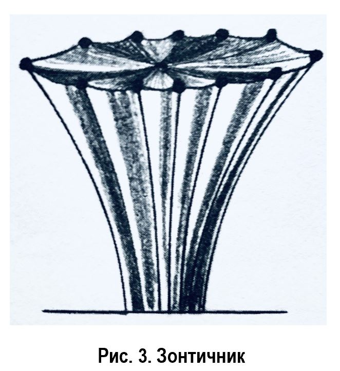 Растения Яйца добывают пропитание, извлекая энергию из горячей звездной коры при помощи корневой системы, а затем отводя отработанное тепло в прохладное небо. Один из основных представителей звездной флоры – это лепестковое растение, также известное, как зонтичник (см. рис. 3). Их корневая система состоит из одного стержневого корня, уходящего вглубь коры. От корня отделяются двенадцать «стволов» – крепких, искривленных элементов, работающих на сжатие, и соединенных с центральной опорой при помощи нитей напряжения. Между каждым из стволов и верхней частью растения натянута мембранная «кожица». Верхняя мембрана, обращенная к холодному небу, имеет темный цвет и отличается высокой излучательной способностью. Каждый из двенадцати стволов оканчивается органами, отвечающими за рассеивание и сбор пыльцы.