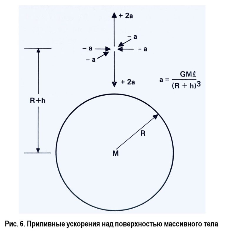Рис. 6 демонстрирует основную проблему, с которой сталкиваются желающие поближе познакомиться с нейтронной звездой. Если наш космический корабль движется по орбите, находящейся на высоте h над поверхностью звезды массой M и радиусом R, то единственной точкой, находящейся в состоянии свободного падения, будет центр судна. Все остальные предметы внутри космического аппарата (включая членов экипажа) будут подвержены влиянию приливных сил.