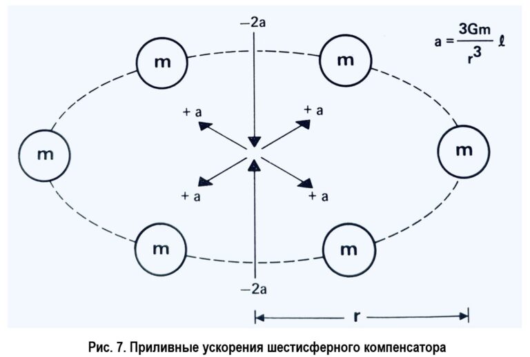 Для противодействия приливным силам экипаж Сент-Джорджа соорудил приливный компенсатор, состоящий из шести ультраплотных масс, образующих кольцевую формацию вокруг корабля. Как видно из рис. 7, в середине кольца приливная картина в точности противоположна той, что наблюдается над одной, изолированной массой. Подобрав массу m каждого из шести тел, а также радиус кольца r, нам удалось нейтрализовать приливные силы нейтронной звезды и подобраться к ней достаточно близко, чтобы собрать научные данные.