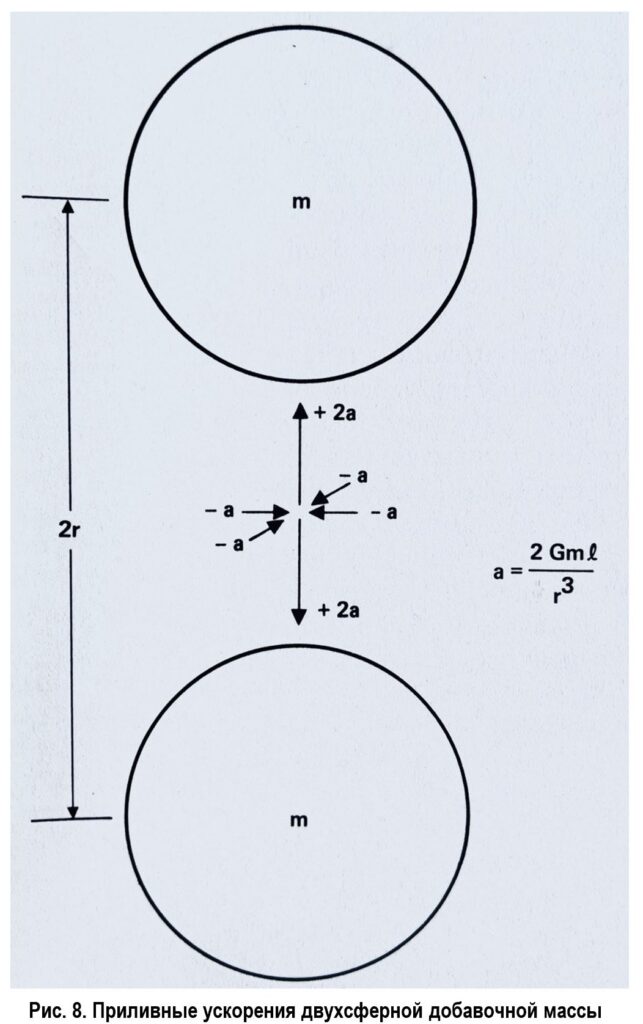 Впоследствии, когда чила решили сжать компенсаторное кольцо, приливы от каждой из шести масс стали мощнее приливов самого Яйца, так что последние пришлось «усилить», чтобы суммарная приливная сила оставалась примерно равной нулю. Для этого, как показано на рис. 8, чила воспользовались системой из двух добавочных масс. Такая конфигурация обеспечивает нулевую гравитацию в средней точке, поэтому орбитальные параметры тел, заключенных между добавочными массами, остаются неизменными, а ускорения в точках, удаленных от центра, возрастают точно так же, как и приливные ускорения над одиночной массой. Подробное описание приливных сил, а также способов их нейтрализации и увеличения при помощи конфигураций плотных сфер можно найти в одной старой статье, посвященной созданию локальной пикогравитации в окрестностях Земли [5].
