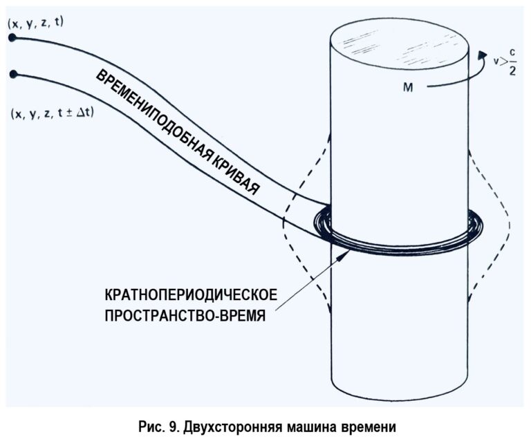 Чила также располагали машиной времени, которая позволяла им передавать сообщения в прошлое и будущее. Устройство такой машины – несмотря на парадоксы, которая она могла бы создать, если бы ее построили на самом деле – можно объяснить при помощи общей теории относительность Эйнштейна. Если длинный, ультраплотный цилиндр (см. рис. 9) неким образом раскрутить вокруг продольной оси, пока линейная скорость периферийных точек не превысит половину скорости света, то, как показывает несложный анализ [6], в районе его центра – но при этом за пределами самого цилиндра, – возникает область смешения пространства и времени. При подходящем выборе траектории объект или фотон можно заставить двигаться вокруг цилиндра – как в сторону его осевого вращения, так и против нее – в результате чего тот оказывается либо в прошлом, либо в будущем. Каким образом чила удалось изготовить вращающийся ультраплотный цилиндр и поддерживать его вытянутую форму достаточно долго для передачи сообщений, остается неясным.