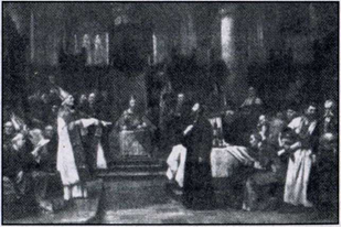 Семь надменных епископов лишили Гуса занимаемой им должности священника. Они приказали ему подняться на помост и одеться в священнические одеяния, как будто он проводил мессу.