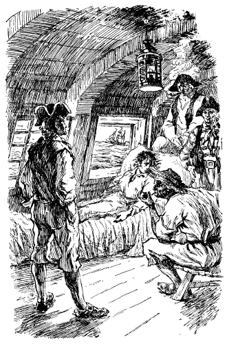 Кормова рубка, куди я поспішав і де мав тепер прислуговувати й спати, здіймалася футів на шість над палубою і порівняно з розмірами брига була досить велика. Всередині каюти стояли прикріплені до підлоги стіл, лава і дві койки: одна для капітана, а друга для обох помічників, які спали на ній по черзі у вільний від вахти час. На стінах згори донизу були укріплені шафочки для речей командирів і частини припасів корабля. Внизу містилась друга комора, до якої вів люк посеред палуби. Тут зберігалася найкраща їжа, напої, а також порох. Уся вогнепальна зброя, крім двох бронзових гармат, теж стояла в стояку біля задньої стіни кормової рубки. Більшість кортиків зберігалася в іншому місці.