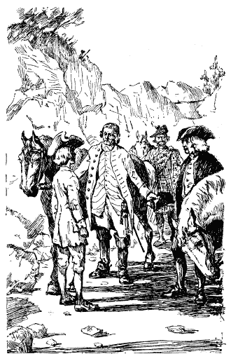 Поки я сидів і роздумував, з лісу долинули голоси людей і кінський тупіт, а незабаром на повороті з'явилися четверо подорожніх. Дорога в цьому місці була така вибоїста й вузька, що вони йшли поодинці пішки, ведучи коней на поводі. Попереду йшов високий кремезний рудоволосий пан з владним червоним обличчям; капелюха свого він тримав у руці й обмахувався ним, бо задихався від спеки. Другого, судячи з його чорного одягу та білої перуки, я цілком слушно взяв за правника. Третій був слугою і носив одяг із тартану, це доводило, що його господар – верховинець, який або перебував поза законом, або ж, навпаки, користувався особливою ласкою уряду, бо закон суворо забороняв носити такий одяг. Коли б я краще розумівся на таких справах, то знав би, що одяг з тартану носили слуги Аргайлів (або Кемблів). До сідла слуги була прив'язана велика валіза, а з кульбаки звисала сітка з цитринами для пуншу; саме так дуже часто тут подорожували багаті мандрівники.