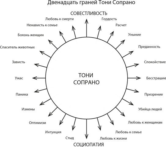 У Тони Сопрано гораздо больше граней, чем у Гамлета. Шекспир окружает Гамлета ансамблем из десяти персонажей, проводящих на сцене всего четыре часа. Дэвид Чейз помещает Тони в ансамбль из нескольких десятков действующих лиц и дает ему восемьдесят шесть часов на решения, действия, поступки и реакции – социальные, личные, частные, сознательные и подсознательные. Тони – это современная модель сложного персонажа, поскольку его грани пересекают все плоскости бытия.