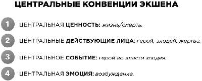 Каждый из перечисленных десяти жанров включает в себя поджанры: у криминального, например, их четырнадцать; у любовного – шесть, у экшена – четыре. Поджанры экшена и шестнадцать их внутренних поджанров мы рассмотрим в части 4.