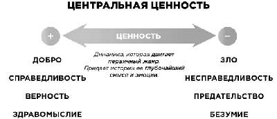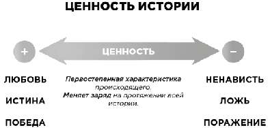 Ценность истории – это ожившее противопоставление положительного заряда отрицательному: истина/ложь, любовь/ненависть, свобода/рабство. События в истории могут замешиваться на динамическом моральном парадоксе (добро/зло), социальной дилемме (справедливость/несправедливость), личном конфликте (преданность/предательство) или душевном расстройстве (здравомыслие/безумие). На протяжении любой истории самые глубокие эмоции вызывает именно центральная бинарная ценность. По мере того как она меняет заряд с положительного на отрицательный и обратно, персонажи одерживают победы и поражения, страдают и выходят живыми из испытаний, и история движется к кульминации и развязке.