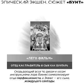 «Лего Фильм» рассказывает историю в жанре экшен-фэнтези, выстроенную вокруг системы образов, в которой отец и сын получают роли правителя и бунтаря. В воображении мальчика его мультяшный аватар Эммет Блоковски сражается с лордом Бизнесом, символизирующим его отца, Того, кто наверху. Представленная в воображаемом мире система образов, противопоставляющая творческую свободу жесткой диктатуре, отражает вечное противоборство между диктующим правила отцом и жаждущим независимости сыном.