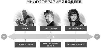 Подытожим: тщеславие злодея противопоставляется альтруизму героя и задает их поляризованную динамичную мораль. Для автора задача злодея – подвергать чужие жизни опасности, свойство жертвы – неспособность спастись, задача героя – одолеть злодея и спасти жертву. Вместе они составляют треугольник взаимоотношений, на котором строится экшен.