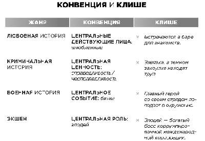 По мере развития первичных жанров сама логика их строения подсказывала определенный сеттинг, роли, события и ценности. Со временем читатели и зрители, привыкнув к этим элементам, заранее настраивались на них как на неотъемлемые составляющие (конвенции) определенного типа или жанра истории. В военной истории должно быть поле боя (сеттинг); в любовной – влюбленные (роли); в криминальной – преступление (событие); в экшене – смертельный риск, борьба не на жизнь, а на смерть (ценность).
