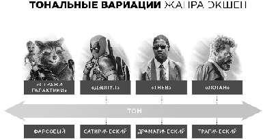 Так у персонажей появляется тональная палитра со всем богатством оттенков от глупца до святого, от фарсового тона («Стражи Галактики», Guardians of the Galaxy) до сатирического («Дэдпул», Deadpool), драматического («Гнев», Man on Fire) и трагического («Логан», Logan).