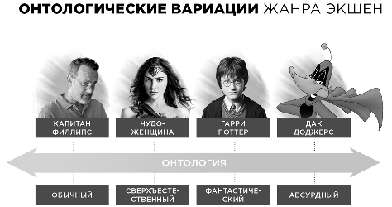 Большинство сюжетов экшена развиваются в обыденном, повседневном антураже, однако ничто не мешает действию происходить и в магическом, фэнтезийном, сверхъестественном или бессмысленном мире. Онтологическая палитра дает нам все многообразие героев – от обычного человека вроде Ричарда Филлипса из «Капитана Филлипса» (Captain Phillips) до неудержимого Брайана Миллса из «Заложницы» (Taken), супергероев вроде Дианы Принс в «Чудо-женщине» (Wonder Woman), фэнтезийных героев вроде Гарри Поттера и безумцев вроде Даффи Дака в «Даке Доджерсе в 241/2 веке» (Duck Dodgers in the 241/2th Century).