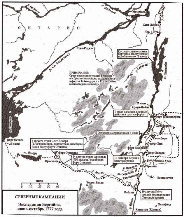 Экспедиция непобедимых 20 июня отплыла из Камберленд-Хед на озере Шамплейн и сошла на берег в Краун-Пойнт, в 13 км к северу от Тайкондероги. Там Бергойн устроил склады и госпиталь. Неделю спустя он снова двинулся в поход, и в конце месяца его войска стояли на расстоянии пушечного выстрела от форта Тайкондерога[663]663
