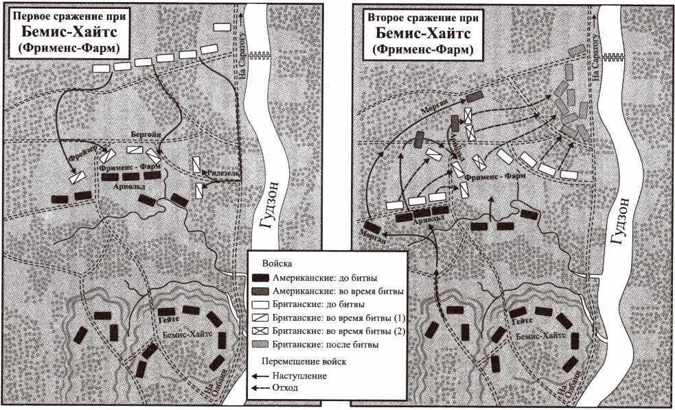 Бергойн переправился через Гудзон примерно в десяти милях выше Бемис-Хайтс и в течение следующих двух дней медленно двигался в южном направлении, высматривая неприятеля. За это время его армия, шедшая тремя колоннами – Ридезель слева вдоль реки, бригадный генерал Джеймс Гамильтон в центре по дороге (шириной в фургон), Фрейзер справа по лесу – преодолела около шести миль. 18 сентября один из фуражных отрядов Бергойна был разгромлен американским патрулем, и Бергойн получил некоторое представление о диспозиции неприятеля. На другое утро, как только рассвело, он отправил свои три колонны вперед с целью нанесения противнику удара по левому флангу и с тыла. Согласно его плану, Фрейзер должен был повернуть на запад, занять возвышенность, после чего повернуть на восток и прижать американцев к реке, где их можно было бы легко перебить. Сражение началось в 10 часов утра, как только выстрелом из пушки был дан сигнал к наступлению. Согласованное начало операции было единственным согласованным действием армии Бергойна в тот день. Правое крыло под командованием Фрейзера имело в своем составе десять рот легкой пехоты и десять рот гренадеров, отряд брауншвейгских стрелков численностью в роту, семь артиллерийских орудий, некоторое количество колонистов-тори и 24-й полк. Общая численность этих сил составляла около 2000 человек. Гамильтон вел центральную колонну, состоявшую из четырех полков общей численностью 1100 человек и шести легких полевых орудий. Левой колонной командовали генералы Ридезель и Филлипс, в распоряжении которых было три брауншвейгских полка и восемь полевых орудий[675]675
