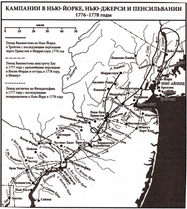 Третьего декабря армия Вашингтона достигла Трентона на реке Делавэр; Хау, присоединившийся к Корнуоллису три дня спустя, приказал возобновить преследование, и на следующий день в который уже раз едва не поймал американцев у Принстона. Утром 8 декабря британцы, войдя в Трентон, обнаружили, что река разлилась, а лодок найти невозможно: переправившись на другой берег, Вашингтон приказал вывести из строя или отогнать к западному берегу все лодки, которые только можно было найти вниз и вверх по течению[631]631