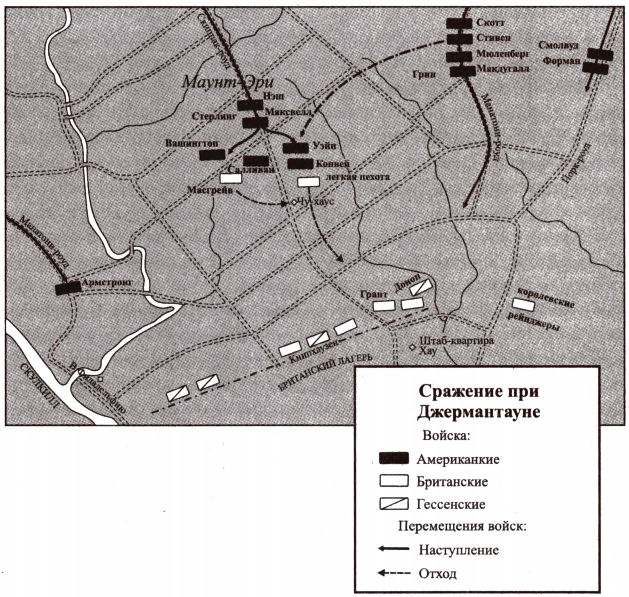 Когда Хау занял Филадельфию, Вашингтон расположился лагерем вдоль реки Скиппак-Крик в 40 км к западу от города. Однако он не собирался сидеть сложа руки. В нем горела неистребимая воля к действию, подпитываемая убеждением в том, что его солдаты, какими бы молодыми и неопытными они ни были, в случае необходимости будут сражаться, не щадя живота. Такая необходимость возникла в начале октября. Жизнь Хау в Филадельфии была далеко не безоблачной. Он контролировал город, но не реку Делавэр, обеспечивавшую удобный доступ в него. Американские форты, расположенные по берегам реки, блокировали все перевозки и не давали британским судам возможности доставлять своим соотечественникам припасы и подкрепления. В своем изолированном положении Хау опасался рассредоточивать солдат по гостиницам и частным домам Филадельфии, а потому расположил около девяти тысяч своих людей биваком под Джермантауном на восточном берегу Скулкилла, в пяти милях к северу от Филадельфии. Еще три тысячи были отправлены для сопровождения транспорта с припасами из Элктона, ползшего сухим путем. Четыре батальона остались в Филадельфии и еще два отправились для захвата Биллингспорта, стоявшего в 12 милях ниже по течению Делавэра. Таким образом, Хау расставил все свои фигуры[694]694