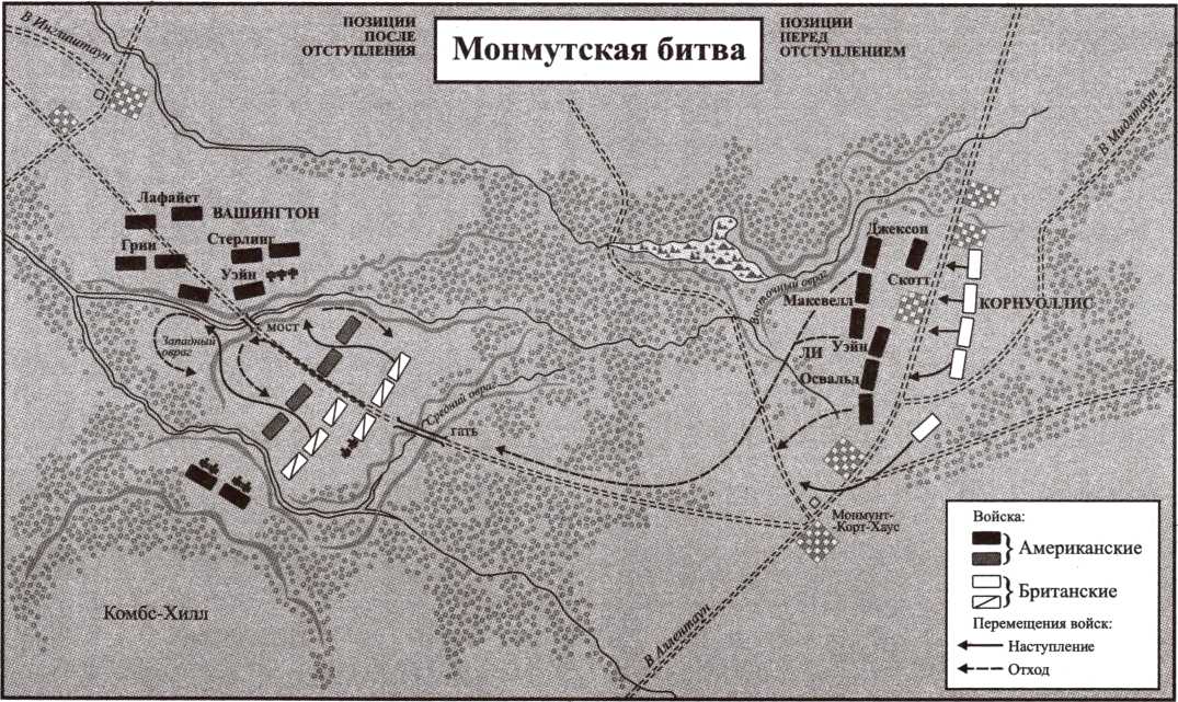 Вашингтон двинул свои войска в тот же день, что и Клинтон, – 25 июня. Он оставил повозки и палатки в Хоупвелле и прибыл в Кингстон – небольшой поселок, расположенный в трех с половиной милях к северу от Принстона и в 25 милях от Монмут-Корт-Хауса. В тот же день он отправил Энтони Уэйна с тысячей солдат из Нью-Гэмпшира – бригадой Пура – на соединение с войсками, следовавшими по пятам за Клинтоном. Штаб этих передовых частей в тот момент располагался в Инглиштауне, примерно в пяти милях к западу от вражеского лагеря в Монмуте, но небольшой американский авангард был рассредоточен, и его подразделения действовали несогласованно. Для исправления ситуации Вашингтон поспешил в том же направлении и, выступив вечером 25 июня, миновал Кран-берри и сделал привал в пяти милях от Инглиштауна утром следующего дня. 27 июня у американцев, как и у Клинтона, был день отдыха.