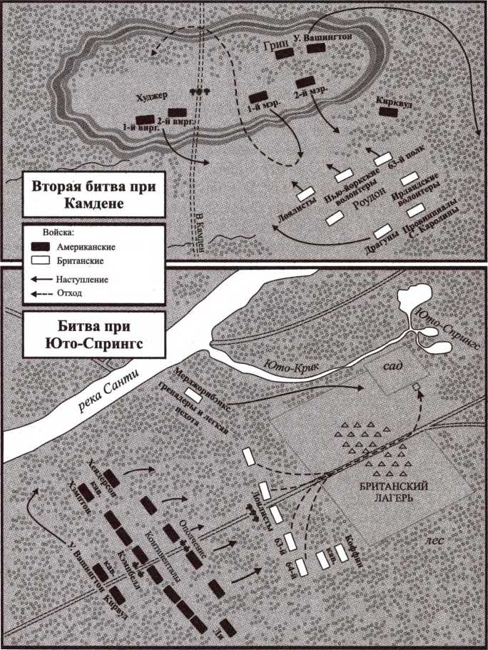 Колонна Грина была изначально построена с таким расчетом, чтобы ее можно было легко развернуть в боевое положение. Теперь он развернул ее в две мощные линии, одна из которых состояла из ополченцев, другая, расположенная в ста ярдах позади первой, – из солдат регулярной армии. На своем правом фланге он поставил легион Ли, на левом – партизанские отряды под началом Джона Хендерсона и Уэйда Хэмптона. Две стороны вступили в ожесточенную схватку примерно через час после инцидента с копателями батата. Линии Грина к этому моменту, по-видимому, несколько расстроились, так как им пришлось прокладывать себе путь через лесные заросли и густой кустарник. Тем не менее ополченцы сражались на совесть, пока солдаты Стюарта не прорвали их центр. Фланги, однако, устояли, и Грин отправил континенталов из Северной Каролины закрыть образовавшуюся брешь. Эти солдаты восстановили американскую линию, но англичане предприняли еще одну атаку и вновь прорвали ее. Тогда Грин направил туда солдат регулярных войск из Виргинии и Мэриленда под командованием Ричарда Кэмпбелла и Ото Уильямса и с удовлетворением отметил, что они владеют штыком не менее искусно, чем европейские профессионалы. Впоследствии он не преминул воздать хвалу этим полкам в своем докладе конгрессу: «Лично я считаю, что мы обязаны своей победой главным образом свободному владению штыком, продемонстрированному виргинцами и мэрилендцами, пехотой легиона и легкой пехотой капитана Кирквуда». Действительно, стремительная атака американских регулярных сил вызвала смятение и беспорядок в рядах англичан, заставив их отступить[869]869
