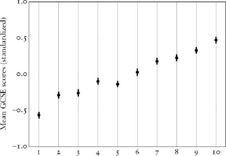 Примечание . Точки обозначают средний балл GCSE для лиц в каждом из десяти децилей от низкого до высокого полигенного балла EA. Линия, проходящая через каждую точку, представляет собой стандартную ошибку среднего значения, которая указывает диапазон оценок, которые можно было бы ожидать в 95% случаев.