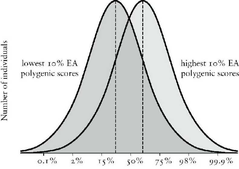 Этот результат служит еще одним напоминанием о том, что полигенные оценки являются только вероятностными предикторами, как и все предикторы, которые мы используем в психологии. Это просто означает, что корреляции меньше 1. Полигенные баллы достаточно хорошо предсказывают средний результат групп, например групп с низкими или высокими полигенными баллами, но внутри каждой группы существует широкий диапазон индивидуальных различий.