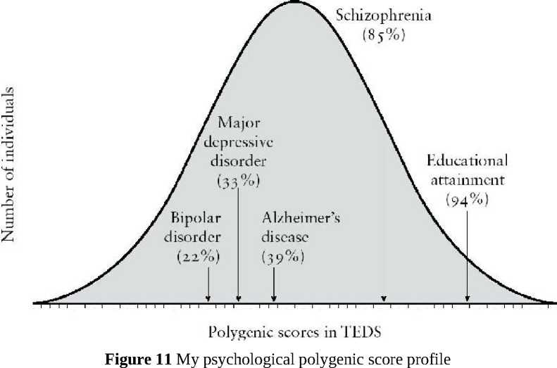 Мы исследовали пять лучших полигенных показателей в психологии на данный момент – шизофрения, биполярное расстройство, большое депрессивное расстройство, болезнь Альцгеймера и уровень образования. Полигенные профили психологических черт нарисуют картину генетических сильных и слабых сторон человека. Такого раньше не было, поэтому Рисунок 11 суммирует мои результаты как первый в мире полигенный оценочный профиль психологических черт. Он показывает мои высокие полигенные баллы по шизофрении и образовательному уровню и мои баллы ниже среднего по биполярному расстройству, большому депрессивному расстройству и болезни Альцгеймера. Некоторые из моих других психологических полигенных показателей средние, например, невротизм, который находится на уровне 66-го процентиля, и гиперактивность, которая находится на уровне 70-го процентиля, но я не считаю эти полигенные показатели достаточно сильными в настоящее время, чтобы включать их в мой профайл.
