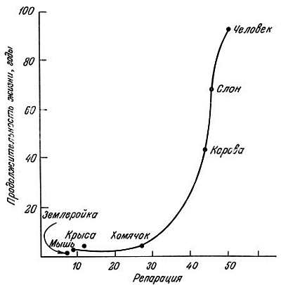 Уменьшение продолжительности жизни под влиянием облучения наблюдали у мыши [13, 14, 72], человека [110] и дрозофилы [3, 28, 69, 83]. Популяция дрозофилы, подвергнутая облучению дозой около 4500 рад, фактически живет дольше, чем контрольная [119]. Такой же результат получен на безмикробных мышах [127]. Симптомы, появляющиеся у облученных особей со сниженной продолжительностью жизни, отличаются от тех, которые возникают во время естественного старения без облучения. Следовательно, проникающая радиация не ускоряет процесс естественного старения, но вызывает раннюю смерть из-за повышения частоты рака или других болезней. Таким образом, укорочение жизни, вызванное ионизирующей радиацией, может представлять собой неспецифический эффект и быть следствием "радиационного синдрома", который не связан с естественным старением.