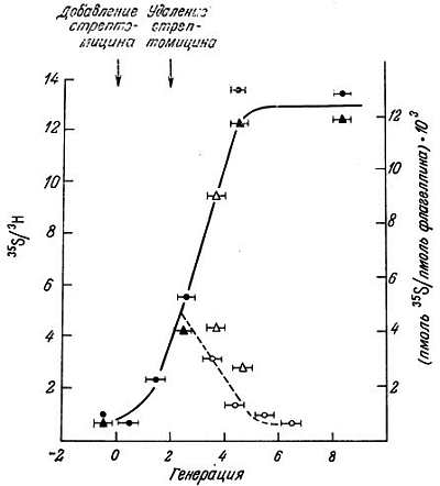 Рис. 9.5. Кинетика частоты ошибки в присутствии и в отсутствие стрептомицина [24]. Культура АС92 была выращена в отсутствие стрептомицина, и в ней была измерена частота фоновой ошибки. В момент, отмеченный стрелкой, добавляли 5 мкг/мл стрептомицина и измеряли частоту ошибки на протяжении более чем восьми последующих генераций. После двух генераций в присутствии стрептомицина из культуры отбирали аликвоту, отмывали минимальной средой без добавок для удаления стрептомицина и ресуспендировали в среде с добавками. Снова вычисляли частоту ошибки. Культуру метили 3Н-аланином (53 Ки/ммоль) и 35S-сульфатом (2 мКд/нмоль) и выделяли флагеллин, как описано ранее [24]. Сплошная линия и темные значки – частота ошибок в клетках, растущих в присутствии стрептомицина; штриховая линия и светлые значки – частота ошибок в клетках после удаления стрептомицина; светлые и темные кружки и треугольники обозначают данные, полученные в двух экспериментах. Длина горизонтальных линий на значках указывает на фракции той генерации, в пределах которой включалась метка