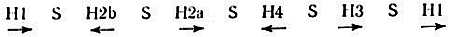 В исследованиях на Drosophila показано, что гены гистонов расположены в хромосоме II. Пять структурных генов пяти гистонов богаты парами G-C и тандемно повторяются. Они разделены участками, богатыми парами А-Т, которые не транслируются. Вся область кодирования генов гистона содержит 6000–7000 пар оснований ДНК. Ниже показаны расположение и длина генов в яйце морского ежа вместе со спейсерными участками (S) [39].