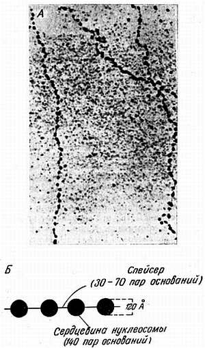 Рис. 2.2. А. Электронная микрофотография хроматина из Oncopeltus fasciatus. В областях, свободных от волокон рибонуклеопротеида, виден хроматин в виде бусин; × 67000 [120]. Б. Схематическое изображение структуры хроматина
