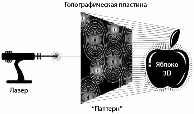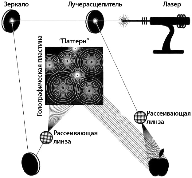 Чтобы продемонстрировать, насколько «вкусна» метафора голограммы, я коснусь некоторых технических моментов, пересказав их на более простом языке. Голограмма создается посредством довольно необычного процесса. Предположим, вы хотите сделать голограмму яблока. Для этого необходимо сначала поместить яблоко в луч лазера. Затем второй лазерный луч отскакивает от отраженного света первого луча, а результирующая интерференционная картина (место, где смешиваются два лазерных луча) запечатлевается на фото– или голографической пластинке, как показано на рис. 5.1.