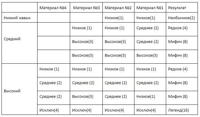 – Эпические вещи появляются только в случае крита при крафте… Статы у предметов бывают соответствующие качеству предмета, но с небольшой погрешностью. Рандом, так сказать. К примеру, как у редкой, так и у мифической вещи могут быть средние статы. Но бывают и сбои, впрочем, довольно редкие. А теперь самое важное. Необязательно использовать самые лучшие материалы, если у тебя нет цели сделать эпическую или легендарную вещь. У каждого материала, есть свой процент влияния на результат. Как бы своё значение. Например, если хочешь получить мифический предмет, то можешь использовать низкое, среднее и высокое качество материалов. Либо только среднее качество. Результат будет один. Низкое и высокое качество как бы взаимоуравниваются. Впрочем, мифическое качество можно получить и на среднем уровне навыка, используя высококачественны материалы. Ещё не запутался?