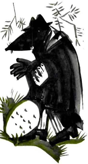Песня была исполнена почти до конца, но, дойдя до того места, где должно говориться о Лисе, Колобок вдруг умолк и всхлипнул. Лиса спросила, что случилось, но он продолжал безмолвствовать, и она была вынуждена повторить: «А от меня?» – и страшно ему подмигнула.