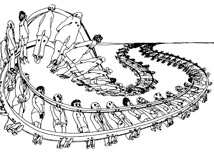 – Теперь представь себе, – не останавливался Стен, полный лекторского энтузиазма, – что матадор делает круг по полоске и снова попадает на арену из противоположных ворот Тогда он будет выглядеть вот так… или вот так… Но ни одно из этих положений не подходит для борьбы с быком. Поэтому матадор должен сделать еше один оборот по ленте Мёбиуса, чтобы все восстановилось, стало нормальным, привычным.