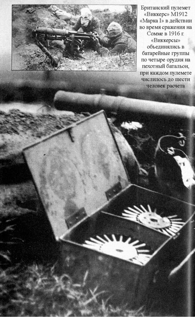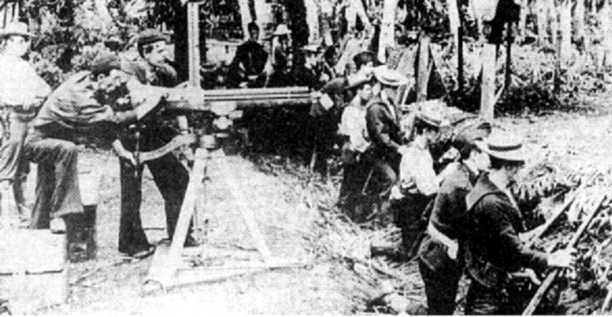 1899 г. Американские морские пехотинцы ведут огонь из поздней модели «Гатлинга» на тихоокеанском острове Самоа. К этому времени «Гатлинг» с коленчатой рукояткой устарел вследствие появления полностью автоматического «Максима», который был принят на вооружение военно-морским флотом США в 1896 г.; в британской армии пулемет появился в 1891 г., а в германской – в 1895 г.