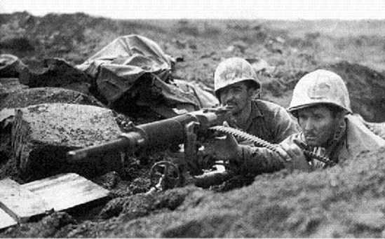 Морские пехотинцы США на острове Иводзима в 1944 г. стреляют из трофейного японского пулемета системы Гочкиса. Японцы взяли «Гочкис» модели 1900 г. французского производства в качестве образца для своей собственной разработки и переконструировали его под штатный японский винтовочный патрон калибра 6,5 мм.