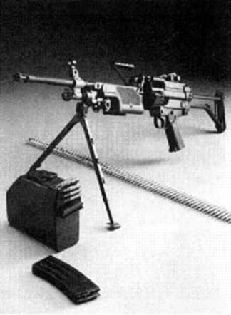 Изготавливаемый бельгийской компанией FN, «Миними» является одним из лучших пулеметов, выпускающихся в настоящее время. Он был принят армией США в качестве оружия поддержки пехоты для замены М60. «Миними» имеет небольшую длину, всего 104 см (41 дюйм), и рассчитан на штатный американский патрон M16 калибра 5,56 мм.