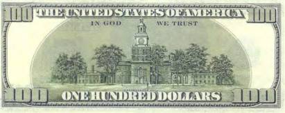 Оборотную сторону банкноты в 2 доллара занимает репродукция с картины Джона Трамбла (John Trumbull) «Подписание Декларации независимости» (1817), которая сегодня висит в ротонде Капитолия. Подписание самого важного в истории Соединенных Штатов Америки документа состоялось 2 августа 1776 г. А принята была «Единогласная декларация тринадцати Соединенных Штатов Америки» (полное оригинальное название документа) еще 4 июля в Филадельфии (штат Пенсильвания). С тех пор 4 июля празднуется самый важный национальный праздник в США – День независимости. Интересно, что из изображенных на картине 48 человек (на банкноте можно видеть только 42), лично поставивших свои подписи на пергаменте Декларации, в момент создания картины были живы только 36. Всего же в подписании документа приняли участие 56 человек, имена которых вошли в историю государства. Этому событию посвящены сотни книг. Не смогли обойти его вниманием и нынешние хозяева Голливуда. В 2004 г. в прокат был запущен очередной приключенческий блокбастер «Сокровище нации». Где Бен Франклин Гейтс, роль которого блестяще сыграл Николас Кейдж, с помощью все той же Декларации отыскивает невероятно большой клад, спрятанный еще отцами-основателями американского государства. Авторы сценария великолепно сплели паутину интриг и тайн, окутавших действие фильма. Впрочем, некоторые из упомянутых там фактов вполне соответствуют действительности. Например, на оборотной стороне стодолларовой купюры США и в самом деле помещено изображение Дворца независимости, где был подписан известный документ (рис. 87).