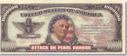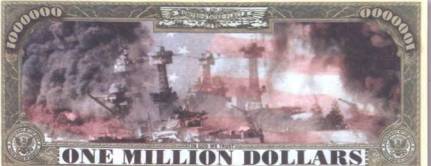 Некоторые сюжеты довольно незатейливы, другие, прямо сказать, вызывающе безвкусны, а третьи несут в себе достаточно глубокий патриотический смысл. Например, изображение на оборотной стороне боны в 1 млн долларов посвящено трагической судьбе американских военных моряков во время бомбардировки японцами 7 декабря 1941 г. Жемчужной бухты (Pearl Harbour) (рис. 98).