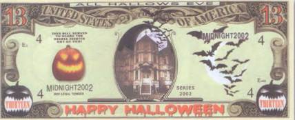В последние годы в коллекциях бонистов по всему миру появилось множество занимательных и экстравагантных банкнот, которые в действительности не выпускались банками и никогда не были предназначены для денежного обращения. Это так называемые сувенирные деньги, по своему оформлению в основном подражающие американским долларам. Создают их частные фирмы и лица с одной-единственной целью – для коллекционеров. Номиналы у них самые разные, а по количеству пририсованных нолей они могут соперничать с китайскими «деньгами ада». Чаще всего можно встретить «купюры» в 1 млн долларов. Но есть и с совсем уж оригинальными номиналами в 4, 13, 66, 2001 доллар и даже в 1 млрд долларов. Нередко номинал этих ненастоящих денег имеет смысловую привязанность к изображенным на них сюжетам. Так, «банкнота» в 13 долларов посвящена Хеллоуину (рис. 97), а в 2001 доллар с повторяющимся набором цифр 911 – 11 сентября 2001 г., когда были атакованы американские башни-близнецы.