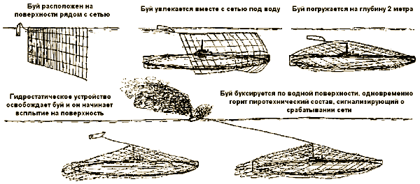 Эффективность сетей, особенно при их применении против аппаратов с собственным движителем (винтом) многократно подтверждалась на практике, в том числе и во время Второй Мировой войны, в ходе которой противолодочные сети (рис. 43) нашли широкое применение. В качестве примера можно вспомнить блокаду немецким флотом подводных лодок Краснознаменного Балтийского флота в Финском заливе, во время которой залив был перегорожен противолодочными сетями в наиболее узкой его части, между островом Нарген и полуостровом Порккала-Удд.