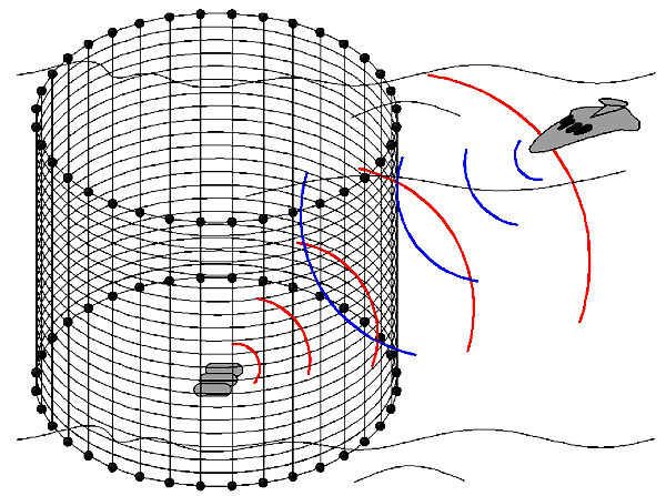 В качестве примера подобной системы можно привести схематичное изображение комплекса, предназначенного для захвата НПА противника, «охотящихся» на АПЛ с межконтинентальными баллистическими ракетами. На рис. 47 показана специальная аппаратура, имитирующая характерные физические поля лежащей на грунте АПЛ (например, магнитное поле). На определенном расстоянии от аппаратуры выставлены специальные сети для поимки аппаратов-охотников. При срабатывании сети, расположенные на ней датчики передают указание для сил специального назначения, которые осуществляют захват аппарата.