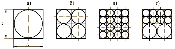 На рис. 54 обозначены: а) модуль 1 уровня; б) модули 2 уровня; в) модули 3 уровня; г) комбинированное размещение модулей 2 и 3 уровня. Разделив поперечное сечение на четыре части, получаем ограничения на размеры модулей второго (рис. 54, б) уровня кратности: Х/2·Х/2·L 2. Если за модуль первого уровня принят калибр 21 дюйм, то модуль второго уровня будет соответствовать калибру 10 дюймов, а размеры модулей третьего (рис. 54, в) уровня кратности будут соответствовать – Х/4·Х/4·L 3(калибр 5 дюймов).