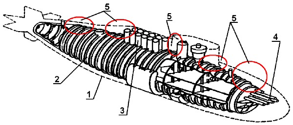 Рис. 56. Обобщенная конструкция современной АПЛ: 1 – легкий корпус; 2 – прочный корпус; 3 – пусковые шахты баллистических ракет; 4 – торпедные аппараты; 5 – места возможного расположения ТПК.